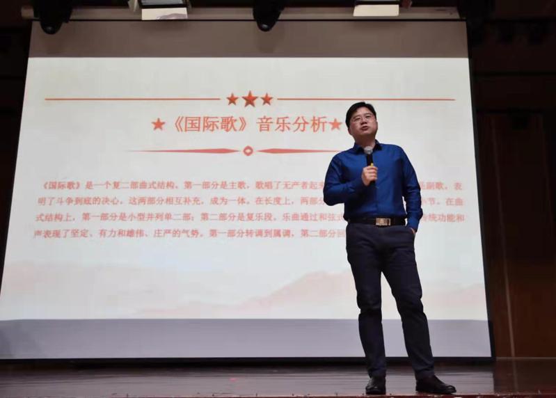 此次音乐党课以《国际歌》《义勇军进行曲》相关的六个问题出发,唐荣老师提出了本次党课的学习方向及目标。并且强调这两部作品对我们今天的音乐创作、音乐教学或理论研究来说,可能产生什么样的借鉴作用或启发意义?面对这两部能够彰显信仰之美、崇高之美的作品,在把立德树人作为教育的根本任务的当下,我们应当从怎样的审美视角去聆听她?应当以怎样的内心情感而共鸣于她?